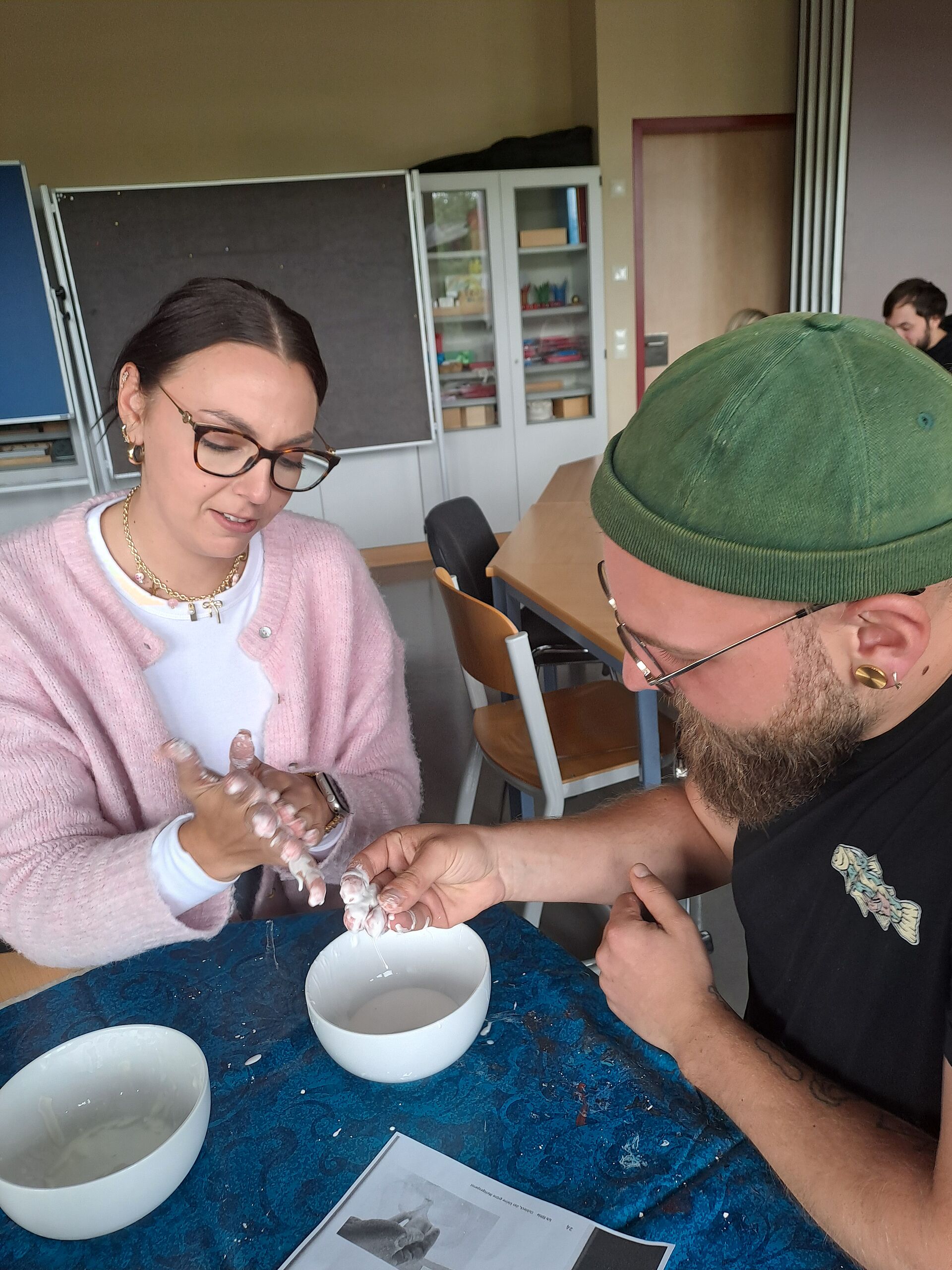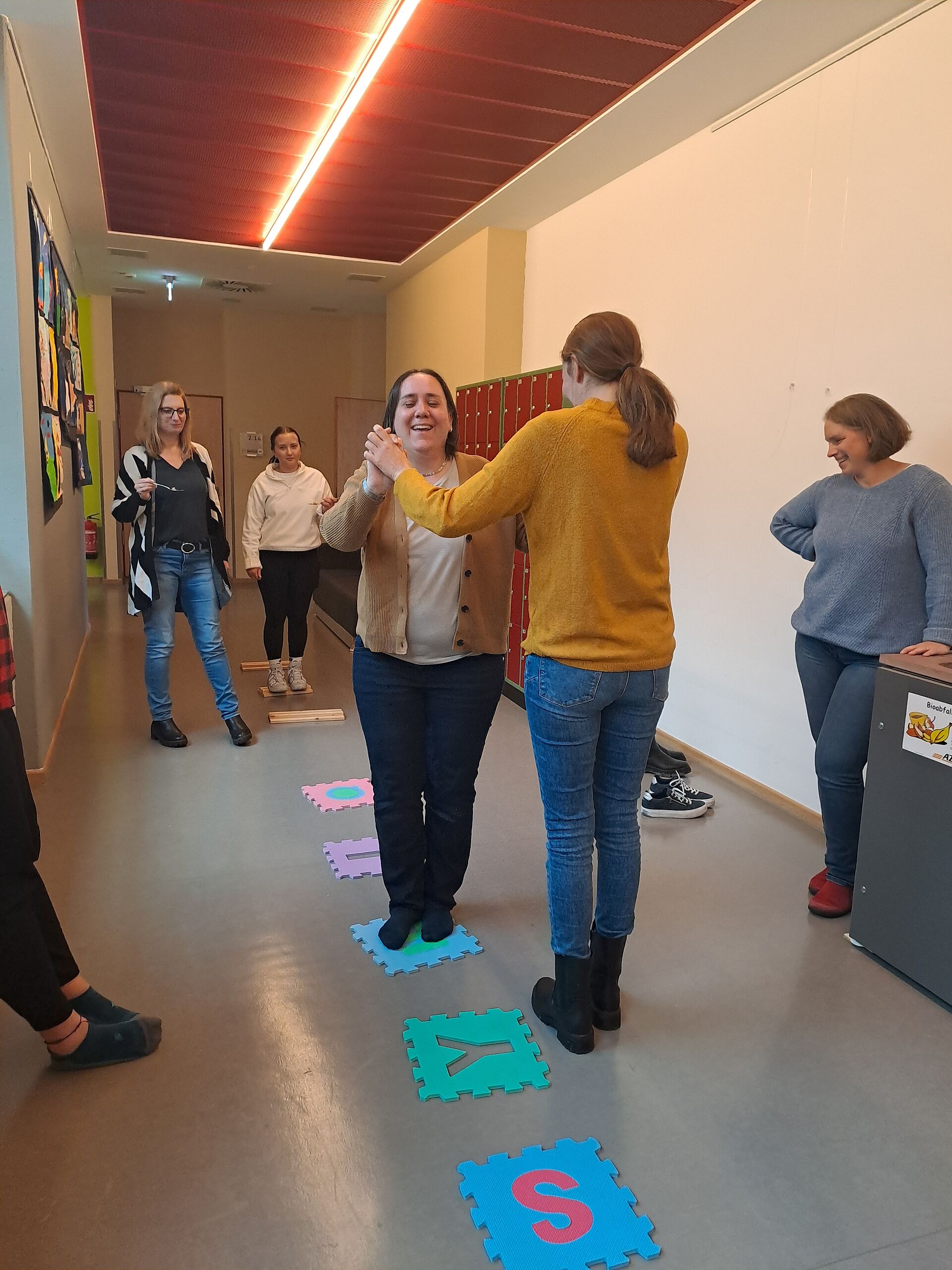 In dem Unterrichtsfach „Spezielle Übungen“ beschäftigt sich der Unterkurs gerade mit „Spielpädagogik“ und „sensorischer Wahrnehmungsverarbeitung“. Neben einem theoretischen Fundament steht in diesen Fächern das praktische Erleben im Vordergrund. Die Studierende sollen aufgrund eigener Erfahrungen Spiele, Material und diagnostische Vorgehensweisen kennenlernen, die sie dann in ihren Einrichtungen oder der bevorstehenden Einzelfallhilfe umsetzen können.